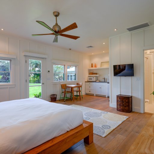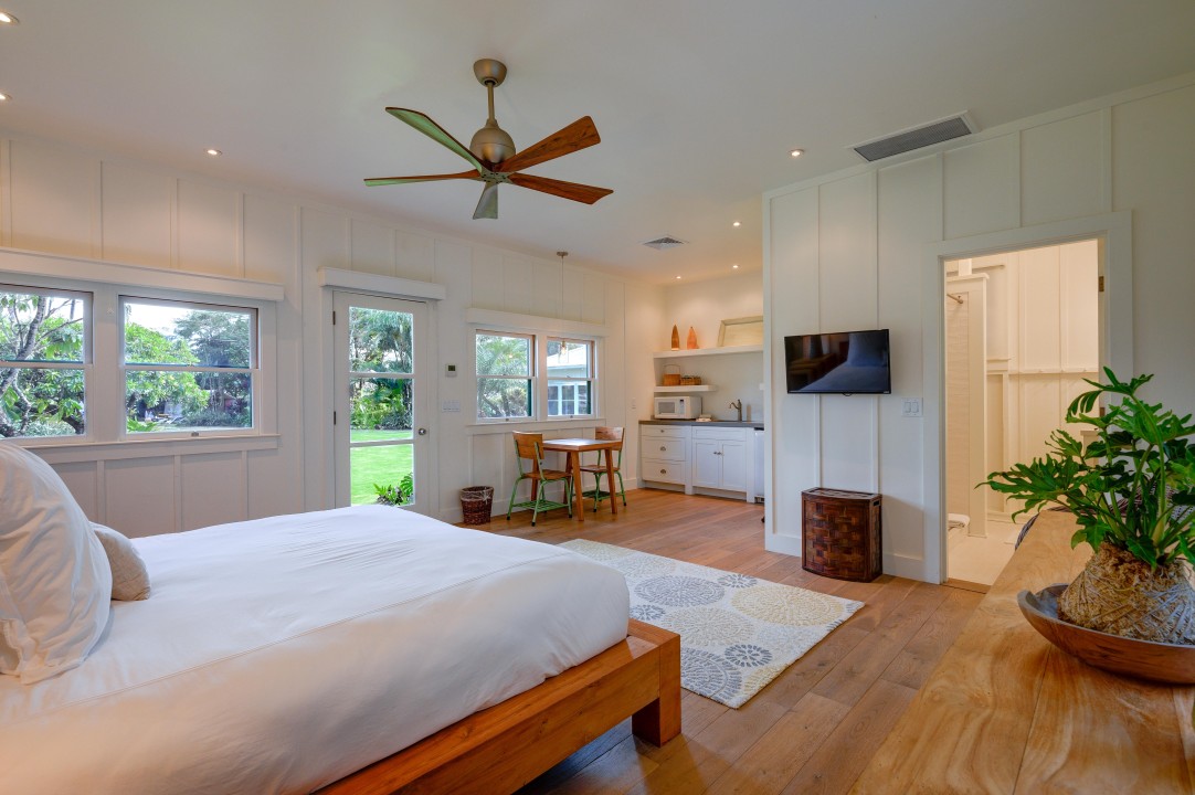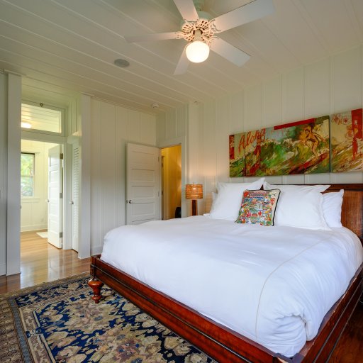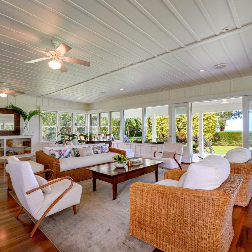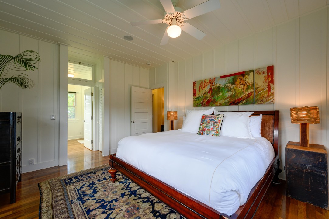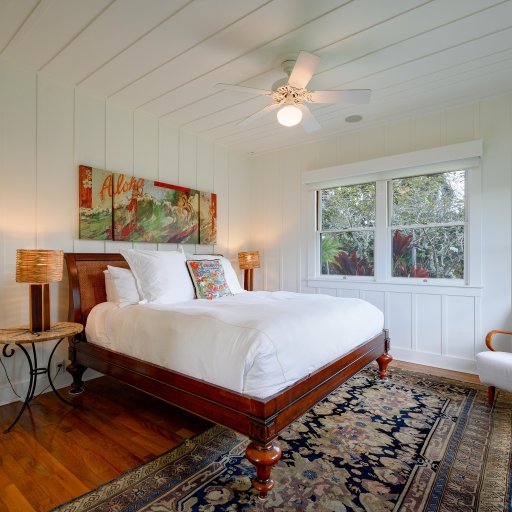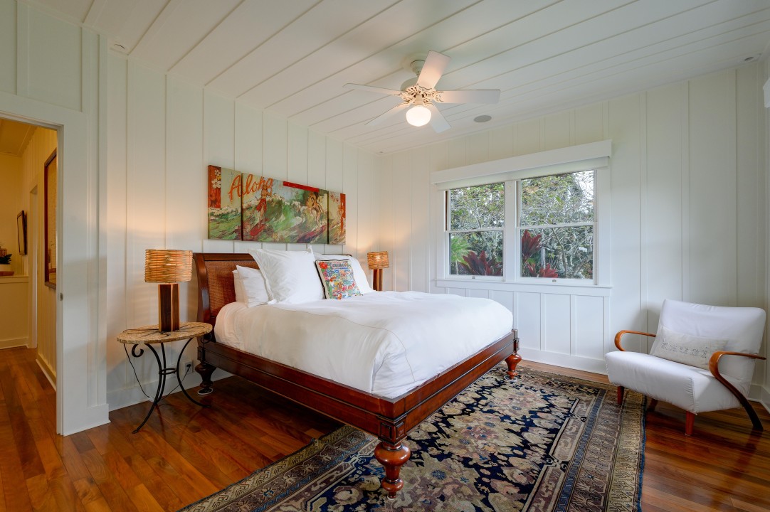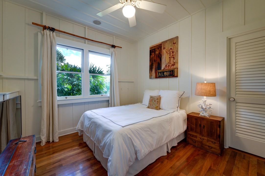 This beautiful beachfront plantation-style home is immaculate. The main house has a spacious kitchen, living & dining room as well as 2 bedrooms - a master suite with a king bed & en suite bath with shower & a queen guest bedroom with bath tub. The detached guest house featuring two separate guest rooms both with King beds. There is also a detached home gym & outdoor shower.