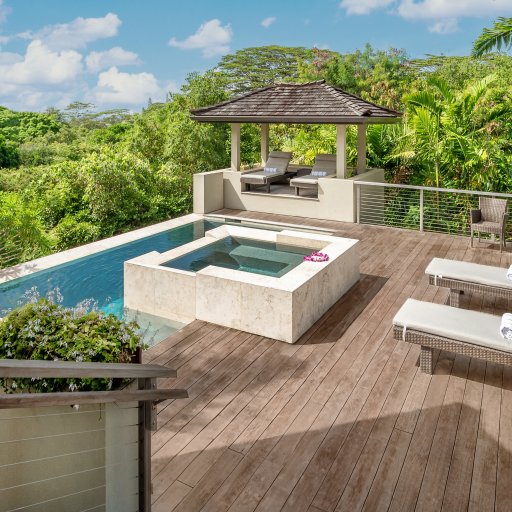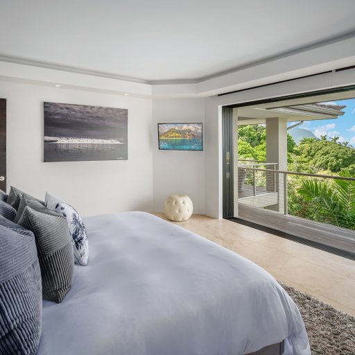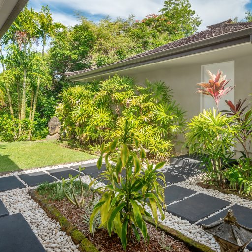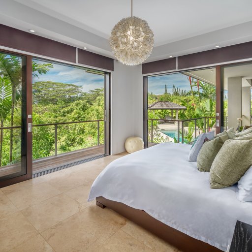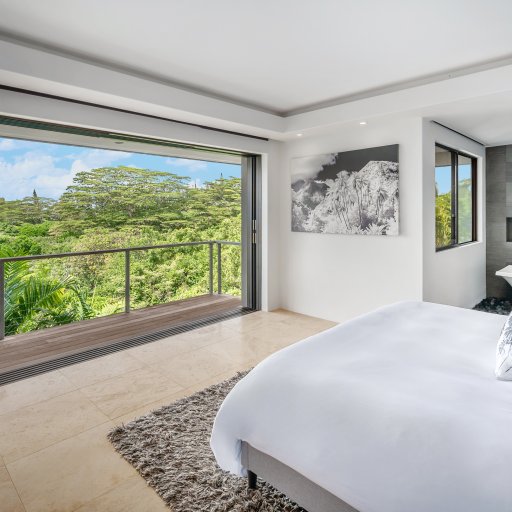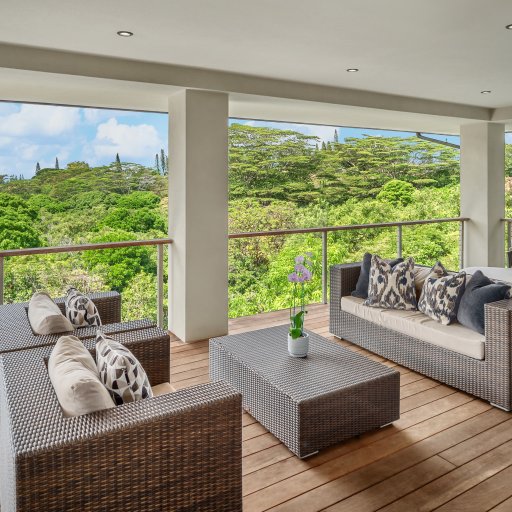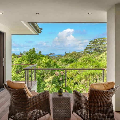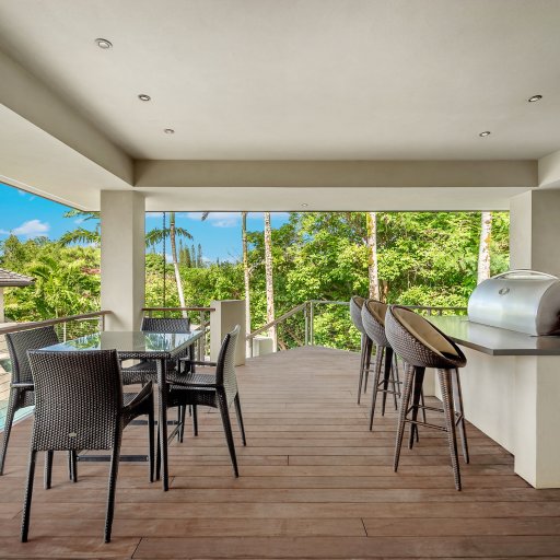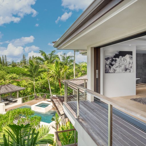 "We had a wonderful stay. The house is immaculate, very spacious and beautifully designed. The outside balconies, deck and pool were wonderful. The view to the mountains on one side and across a lush rainforest to sea on the other side is stunning. I was concerned before about having air con in just the bedrooms as we visited in August but that was not an issue at all. In fact it was nice to have fresh air inside and feel more part of the surrounding nature. The location is very convenient to Princeville yet is still available extremely quiet, private and and all you can see for miles is the stunning natural landscape ."